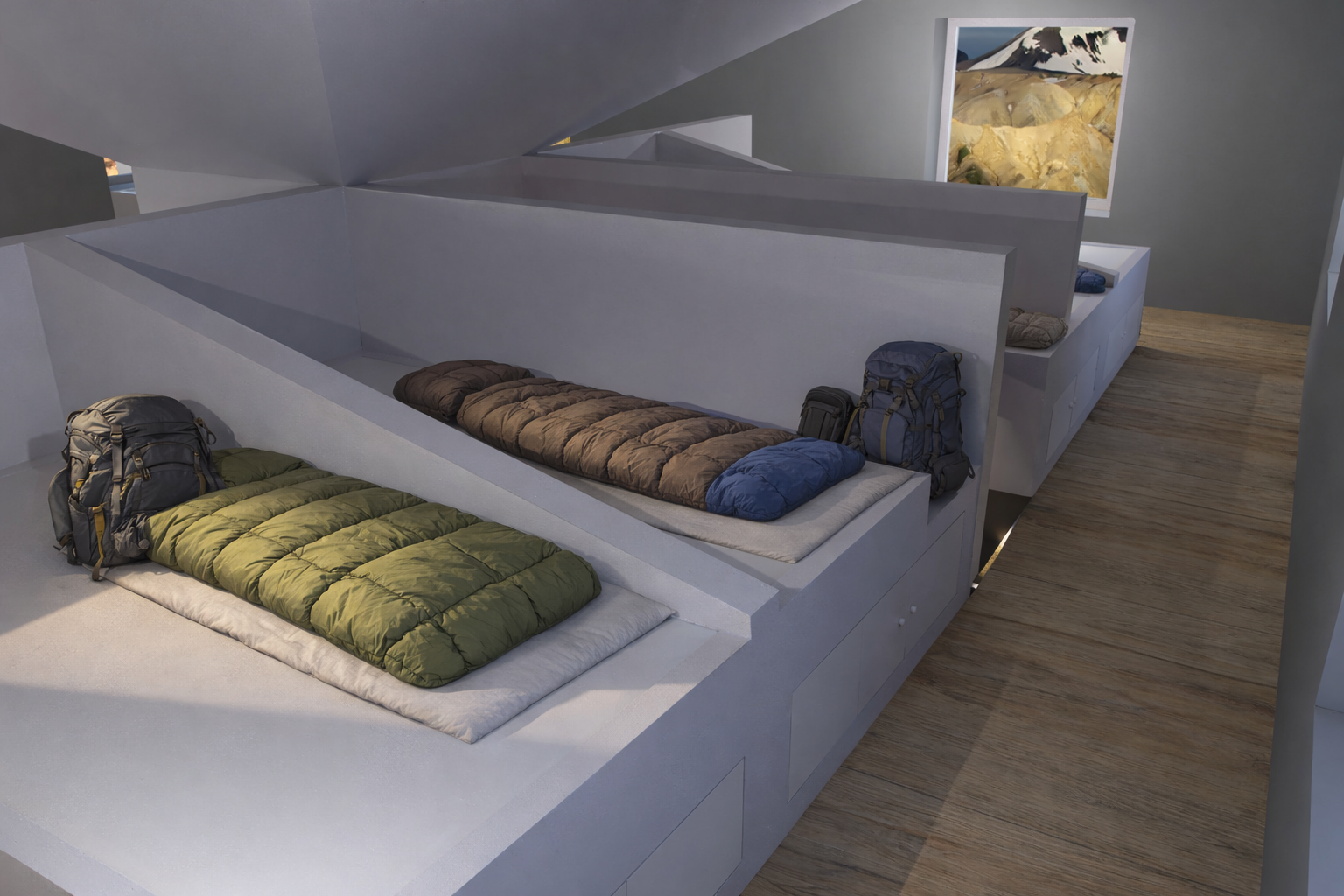 Le Eldfjall, qui signifie volcan en islandais, est basé sur le principe du volcan. Il utilise les ressources naturelles de l'Islande pour créer sa propre énergie et être autonome. Sa structure en entonnoir (volcan inversé) permet de récupérer l'eau de pluie, dans le puit en béton, qui sera par la suite filtrée par un filtre charbon. Le vitrage photovoltaïque et les panneaux solaires, qu'en a eux, permettent de produire l'électricité et le chauffage. Pour être potable, l'eau serait filtrée par le procédé d'osmose inverse. L'Islande étant un pays comportant peu de ressources forestières mais étant active dans l'industrie de l'aluminium, la structure de cet abri est faite principalement de ce matériau local.