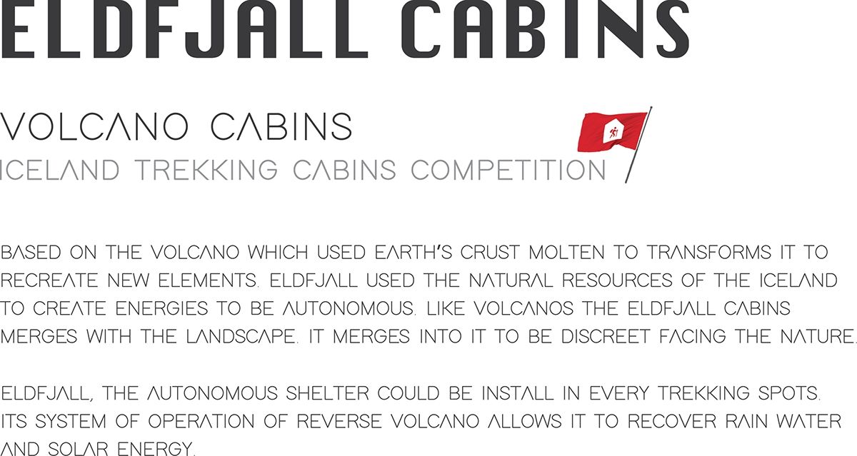 ELDFJALL CABINS est un projet de création de refuges, pour les différents spots de trekking islandais, réalisé dans le cadre du concours Iceland trekking cabins. L'objectif était de créer un prototype de refuge autonome, pouvant être installé dans les différents spots du pays.