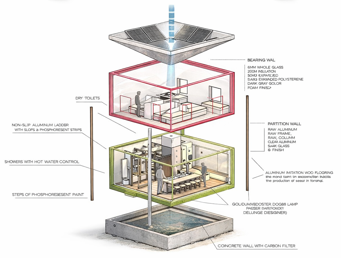 . L'eau de pluie est collectée dans le puits par la colonne centrale (comme dans un entonnoir). Cette eau est filtrée par une grille et le puits. Elle serait utilisée pour les douches, le chauffage et l'eau potable.