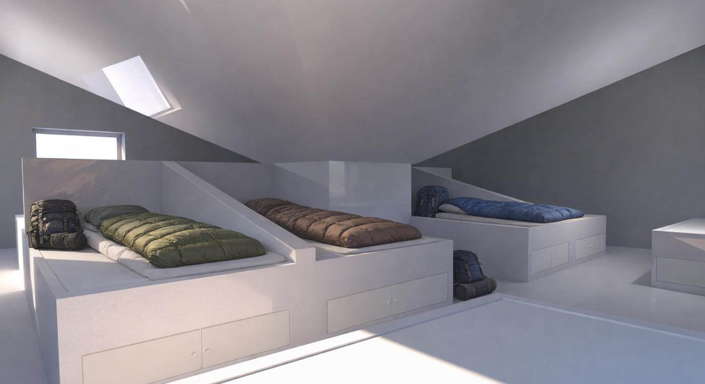 Le Eldfjall, qui signifie volcan en islandais, est basé sur le principe du volcan. Il utilise les ressources naturelles de l'Islande pour créer sa propre énergie et être autonome. Sa structure en entonnoir (volcan inversé) permet de récupérer l'eau de pluie, dans le puit en béton, qui sera par la suite filtrée par un filtre charbon. Le vitrage photovoltaïque et les panneaux solaires, qu'en a eux, permettent de produire l'électricité et le chauffage. Pour être potable, l'eau serait filtrée par le procédé d'osmose inverse. L'Islande étant un pays comportant peu de ressources forestières mais étant active dans l'industrie de l'aluminium, la structure de cet abri est faite principalement de ce matériau local.